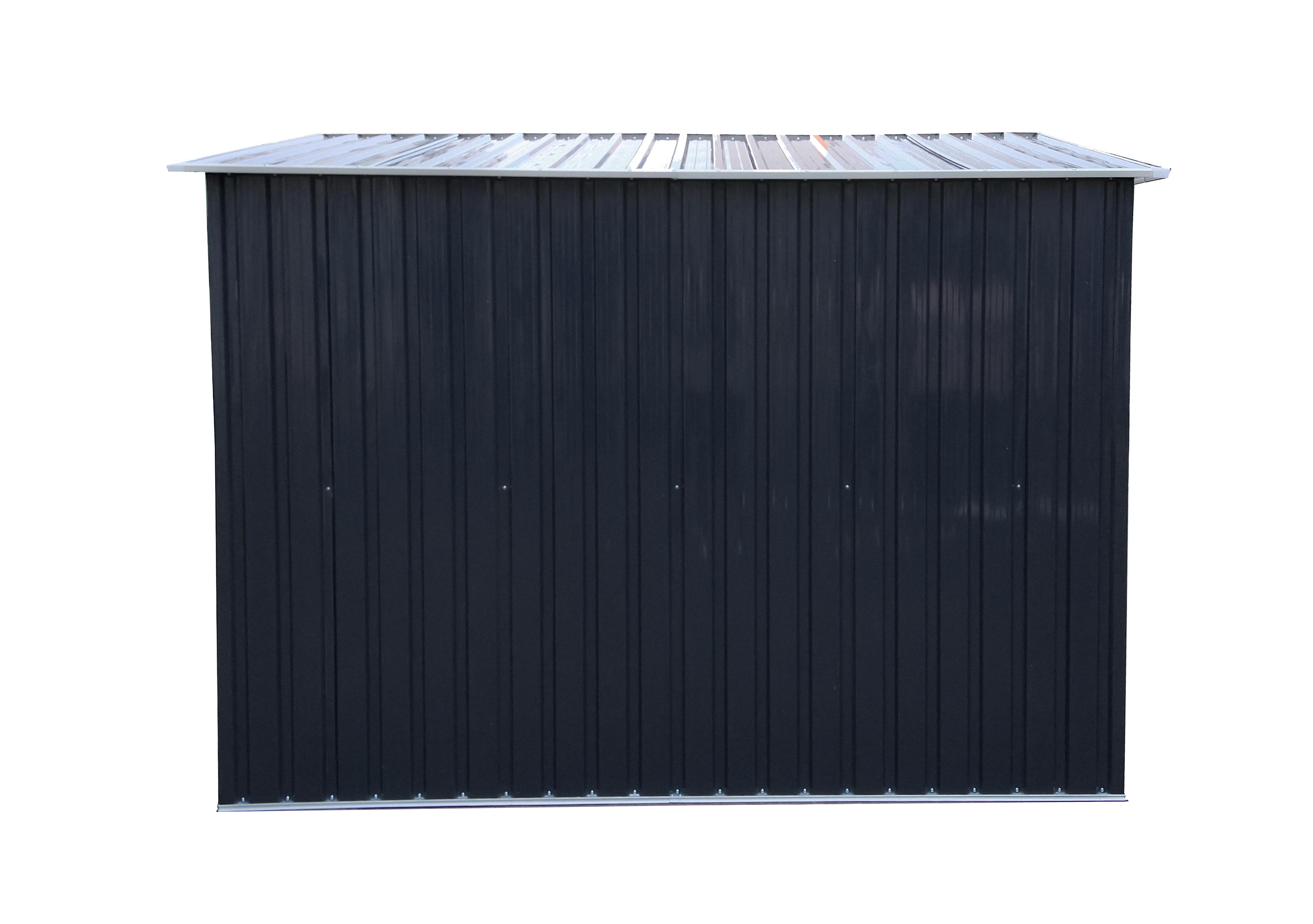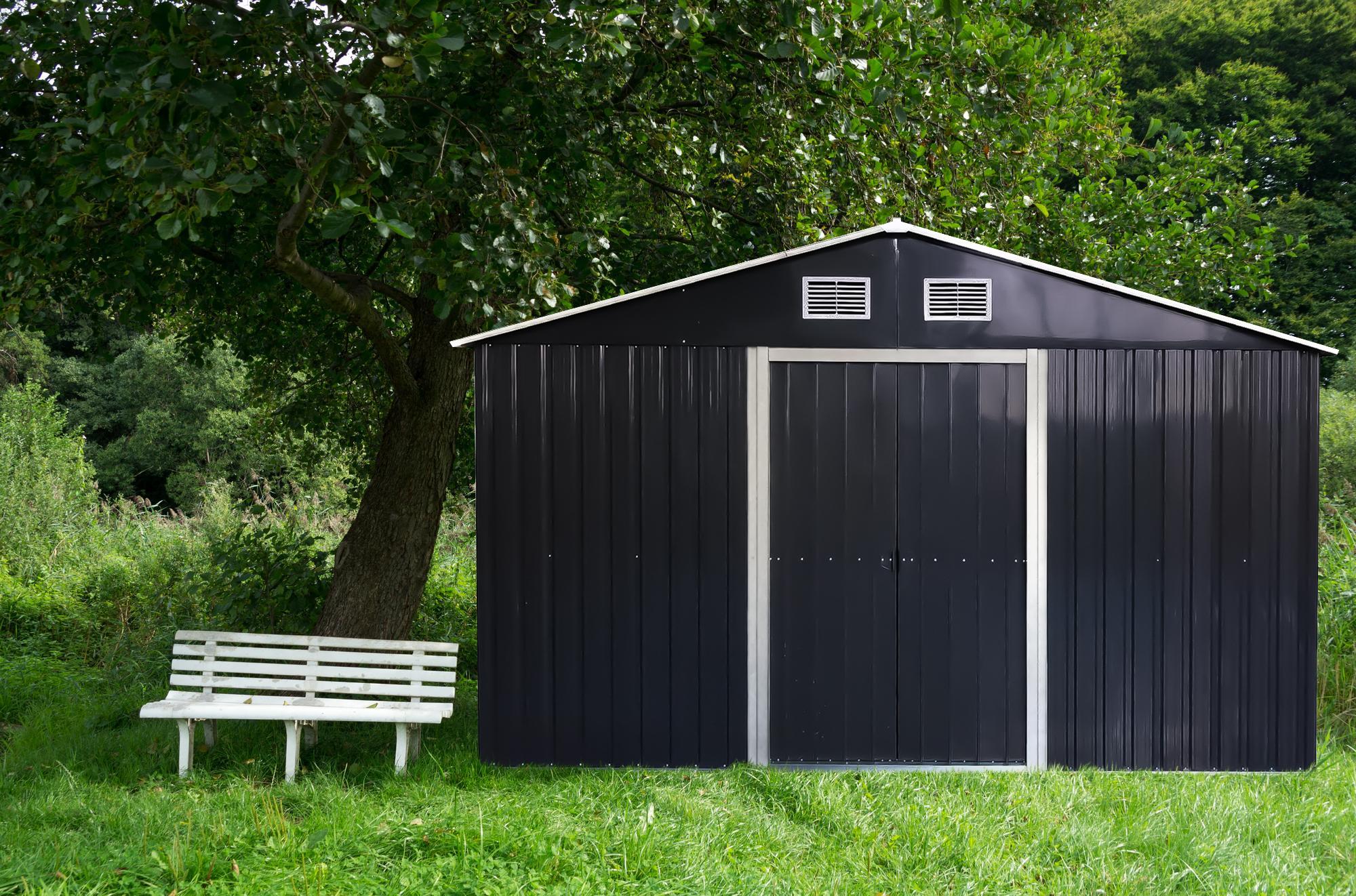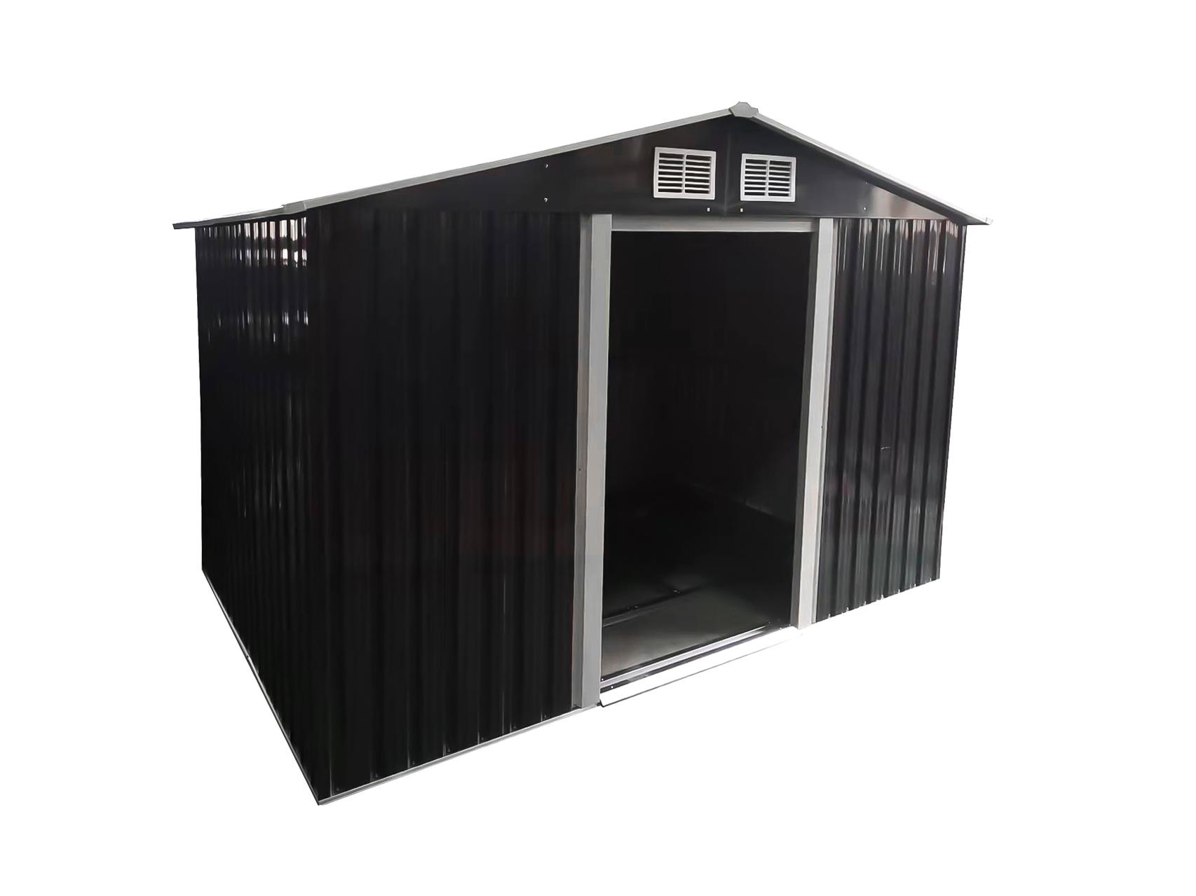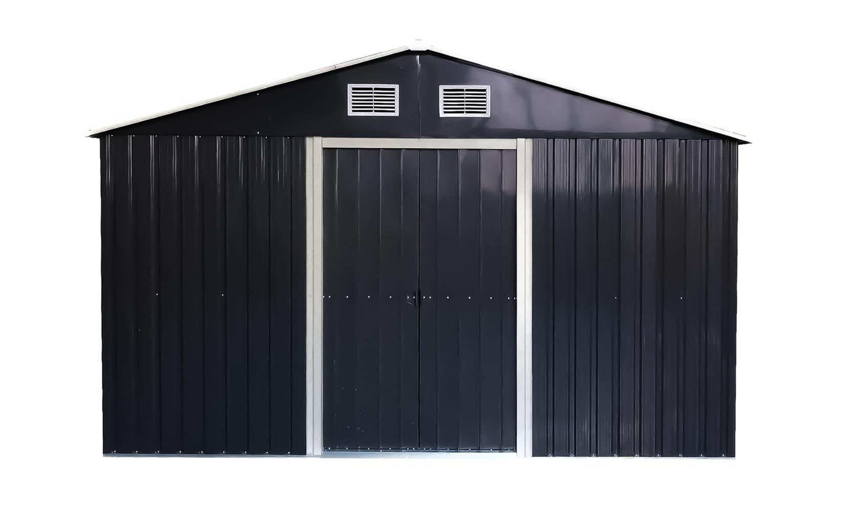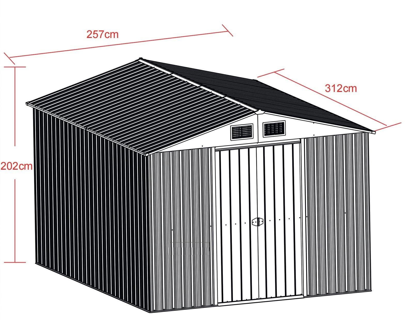 Metalowy domek ogrodowy DM1001 o wymiarach 312x257x202 cm z ocynkowanej stali, podwójnymi przesuwnymi drzwiami i ramą podłogową. Otwory wentylacyjne, wysokość 202 cm — swobodne poruszanie się wewnątrz. Do przechowywania narzędzi, rowerów i sprzętu sezonowego. Montaż wymaga minimum 2 osób. Zalecane kotwienie do podłoża. Nie używać jako miejsca pobytu ludzi ani zwierząt.