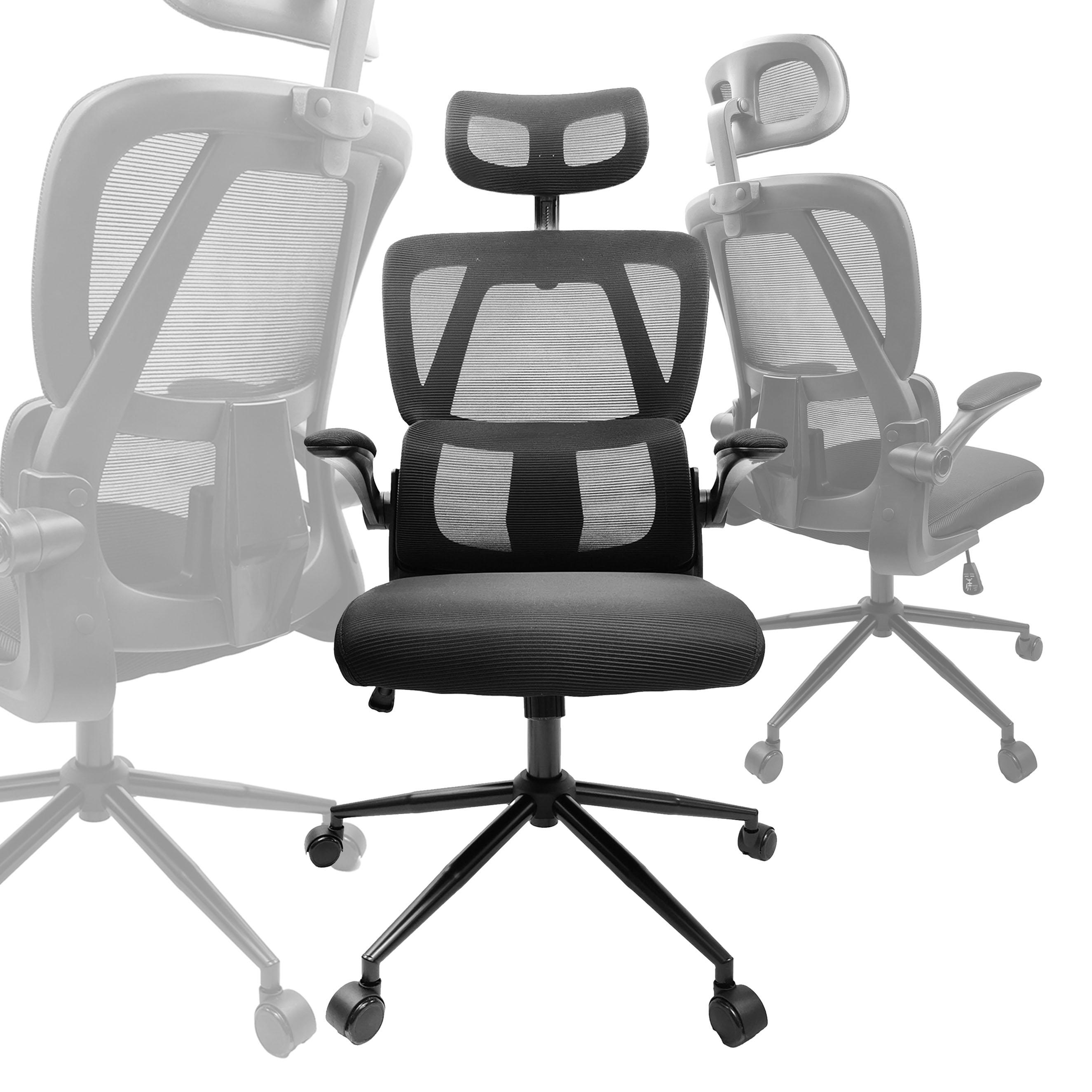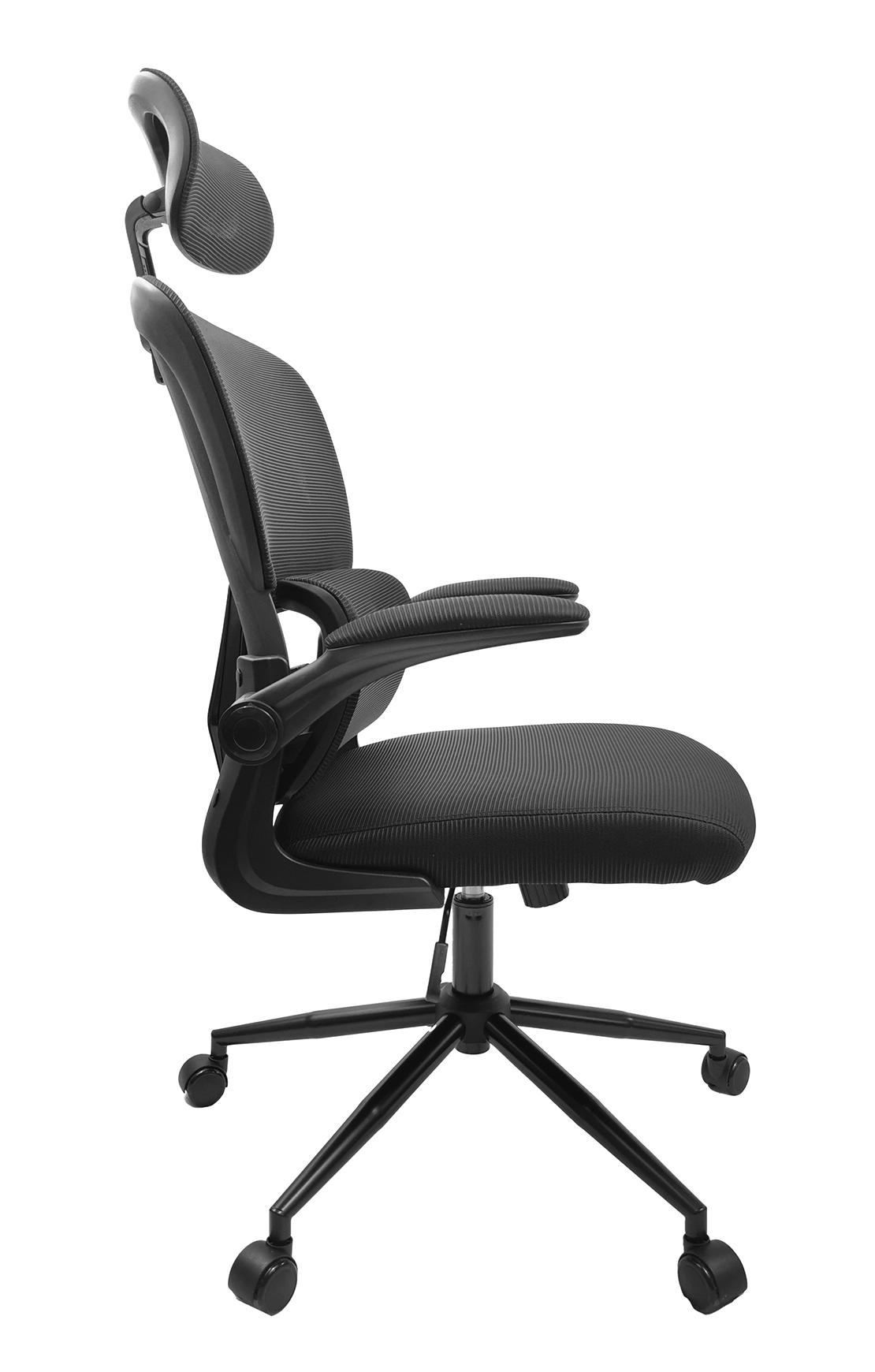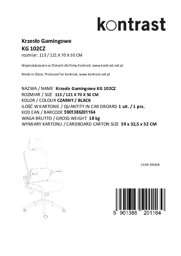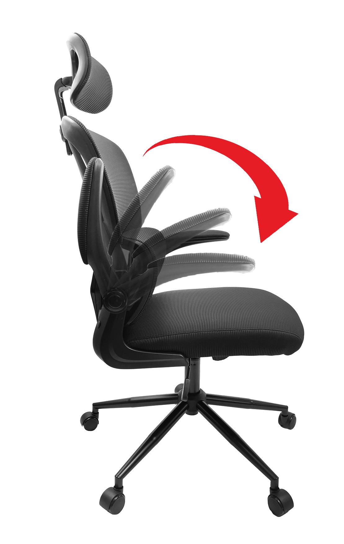 Fotel biurowy KG102 w kolorze czarnym z oddychającą siatką na oparciu i siedziskiem z pianki. Posiada składane podłokietniki, regulowane oparcie (pozycja siedząca do leżącej) oraz regulowany zagłówek. Silikonowe kółka nie rysują podłogi.
