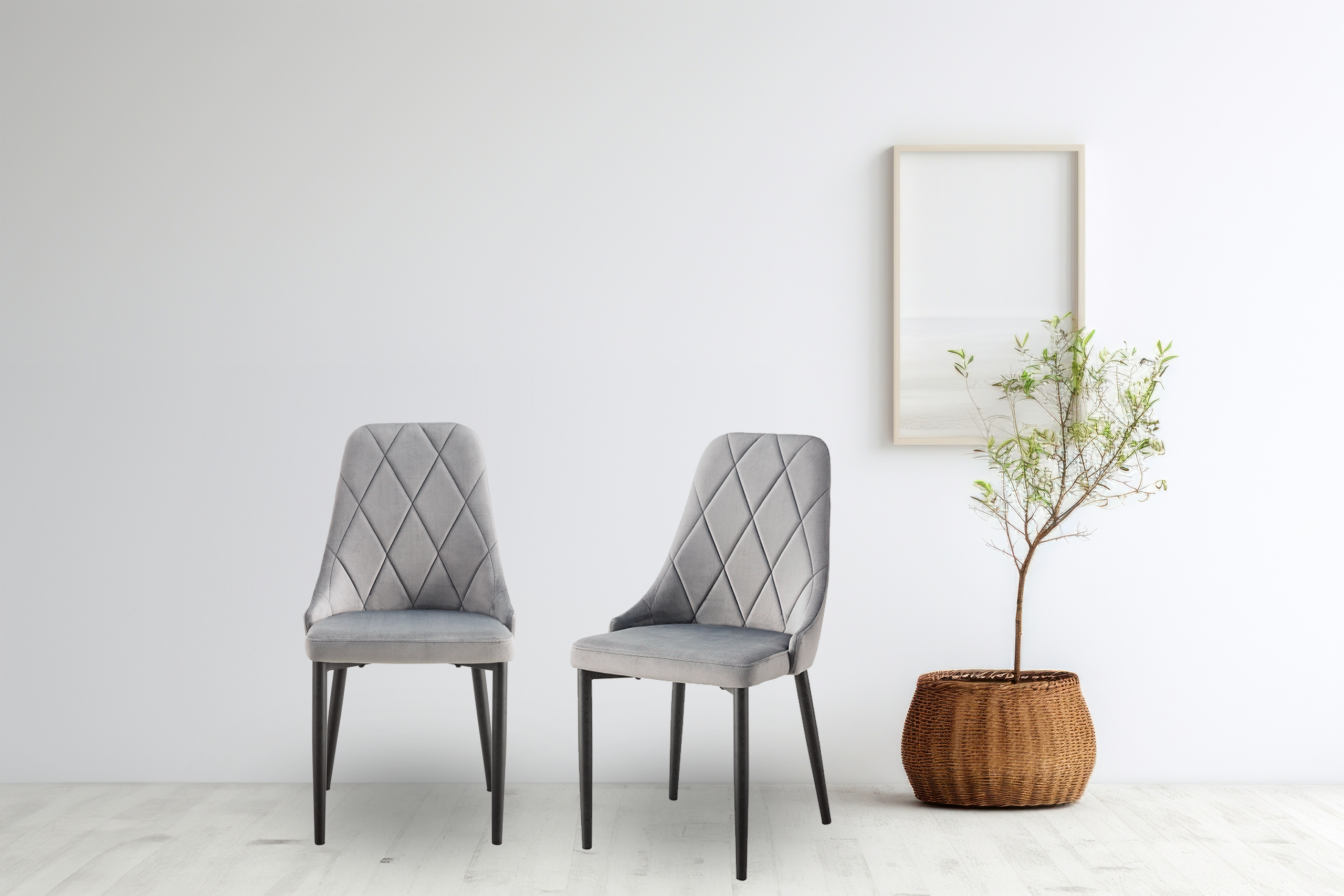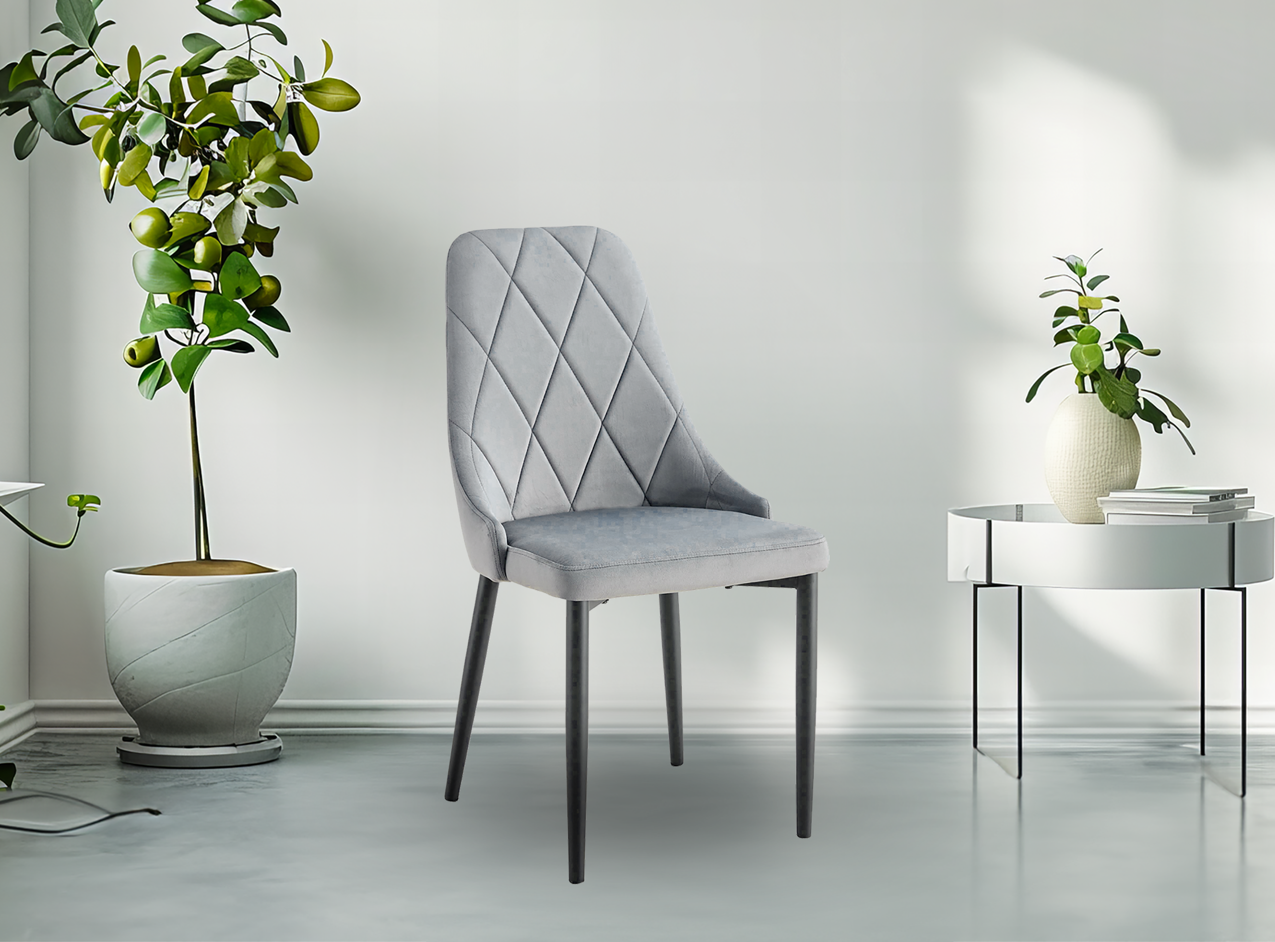 Krzesło tapicerowane glamour EVA 2 KT201 – kolor szary Krzesło EVA 2 w kolorze szarym to połączenie nowoczesnej elegancji i komfortu użytkowania. Wyróżnia się wyjątkowym designem i starannym wykonaniem, które nadają mu styl glamour, idealny do salonu, jadalni lub kuchni. To mebel, który łączy w sobie funkcjonalność i ponadczasowy wygląd. Najważniejsze cechy: Styl glamour – eleganckie przeszycia i aksamitna tkanina vel