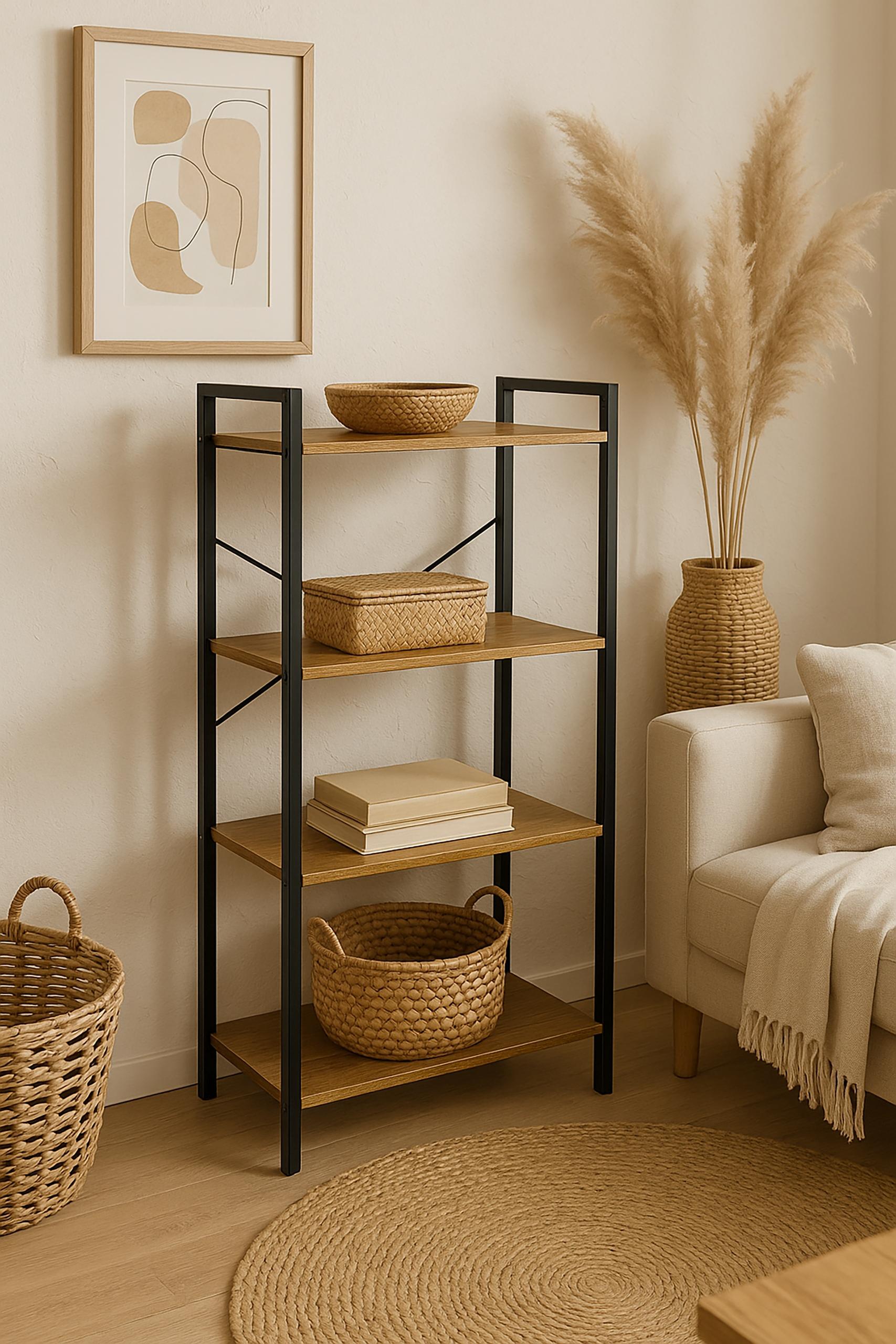 | Głębokość | 30 cm Konstrukcja: stal malowana proszkowo, kolor czarny Półki: płyta MDF z melaminą, kolor dąb Wymiar kartonu: 76,5 × 37,5 × 15,5 cm |