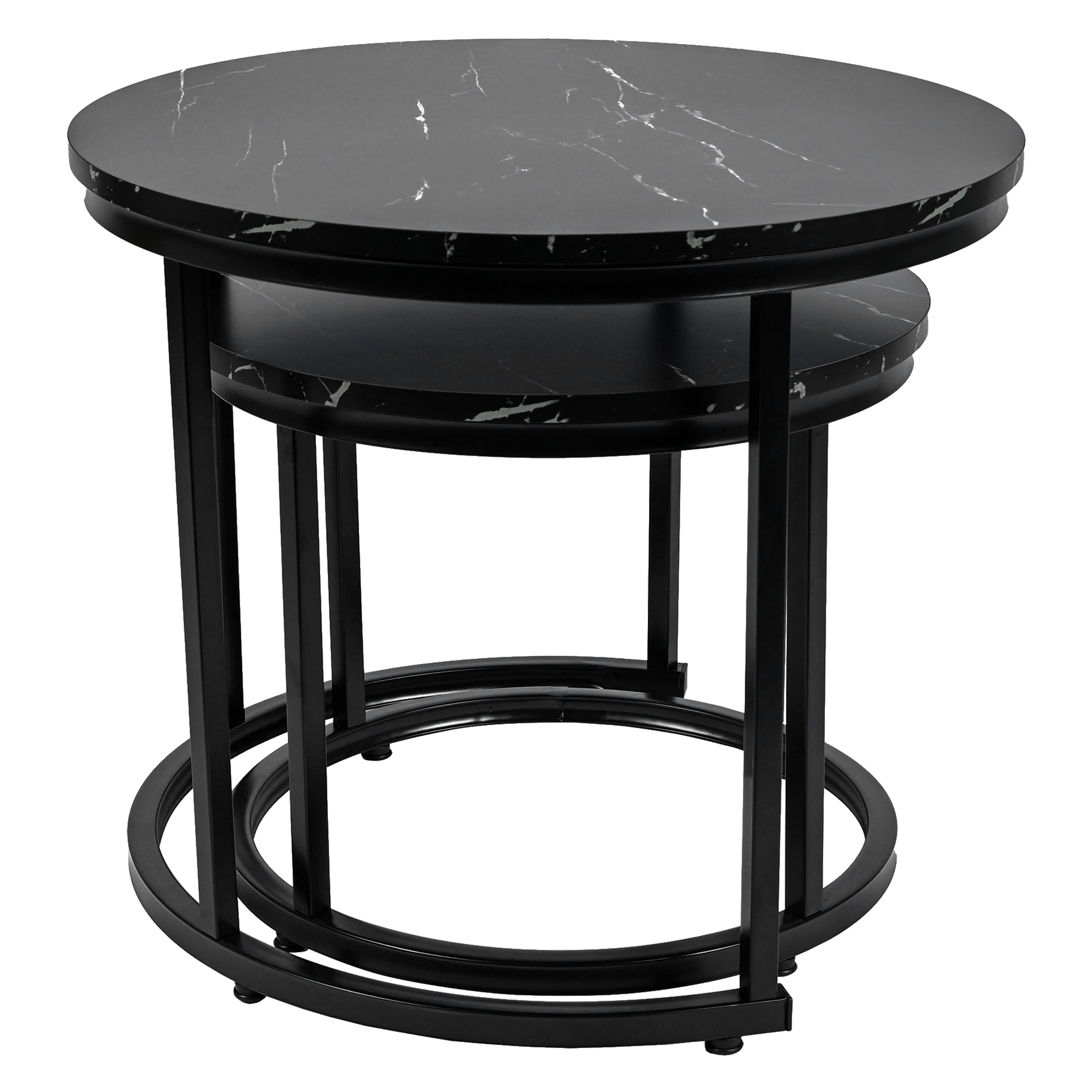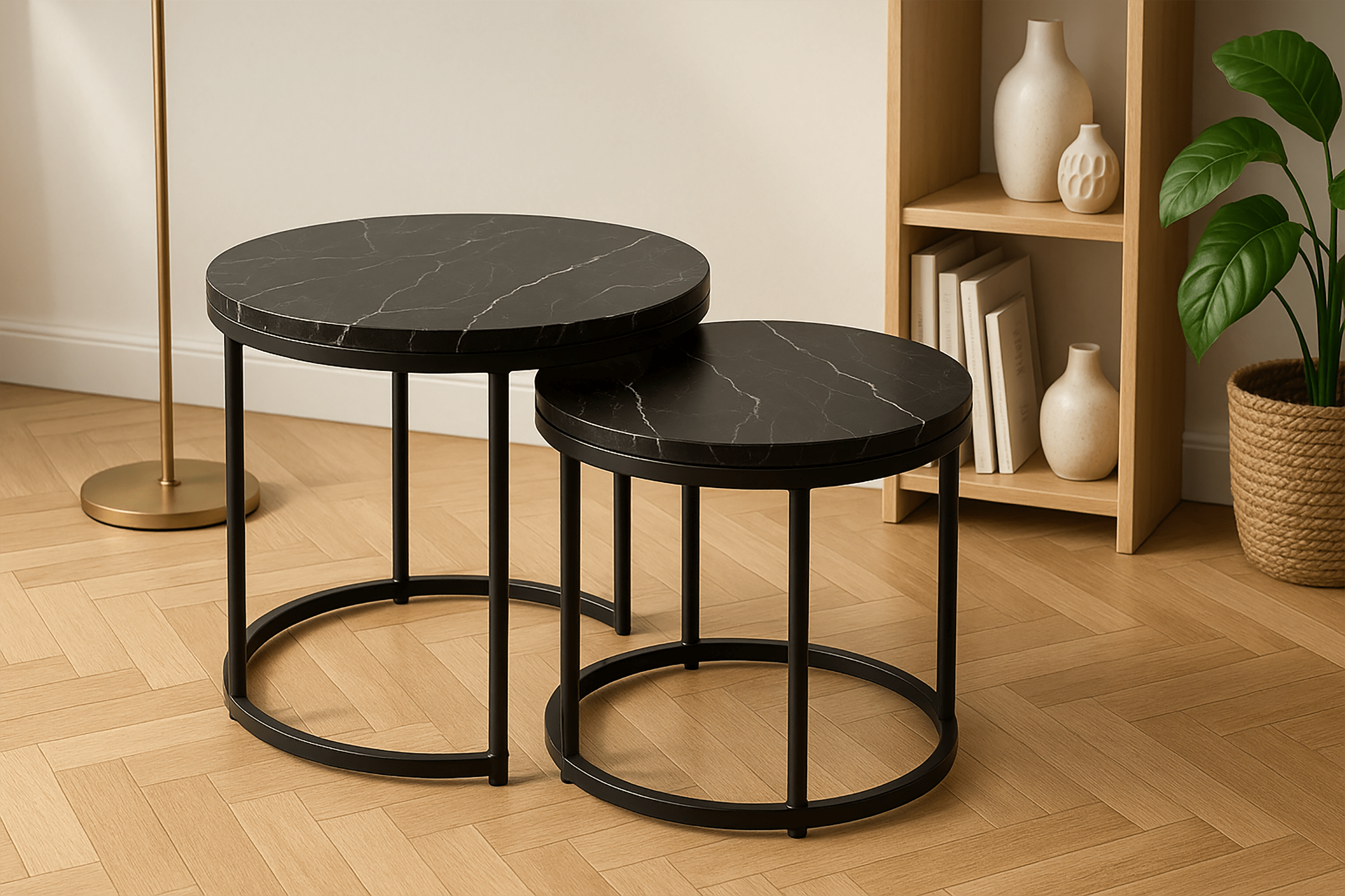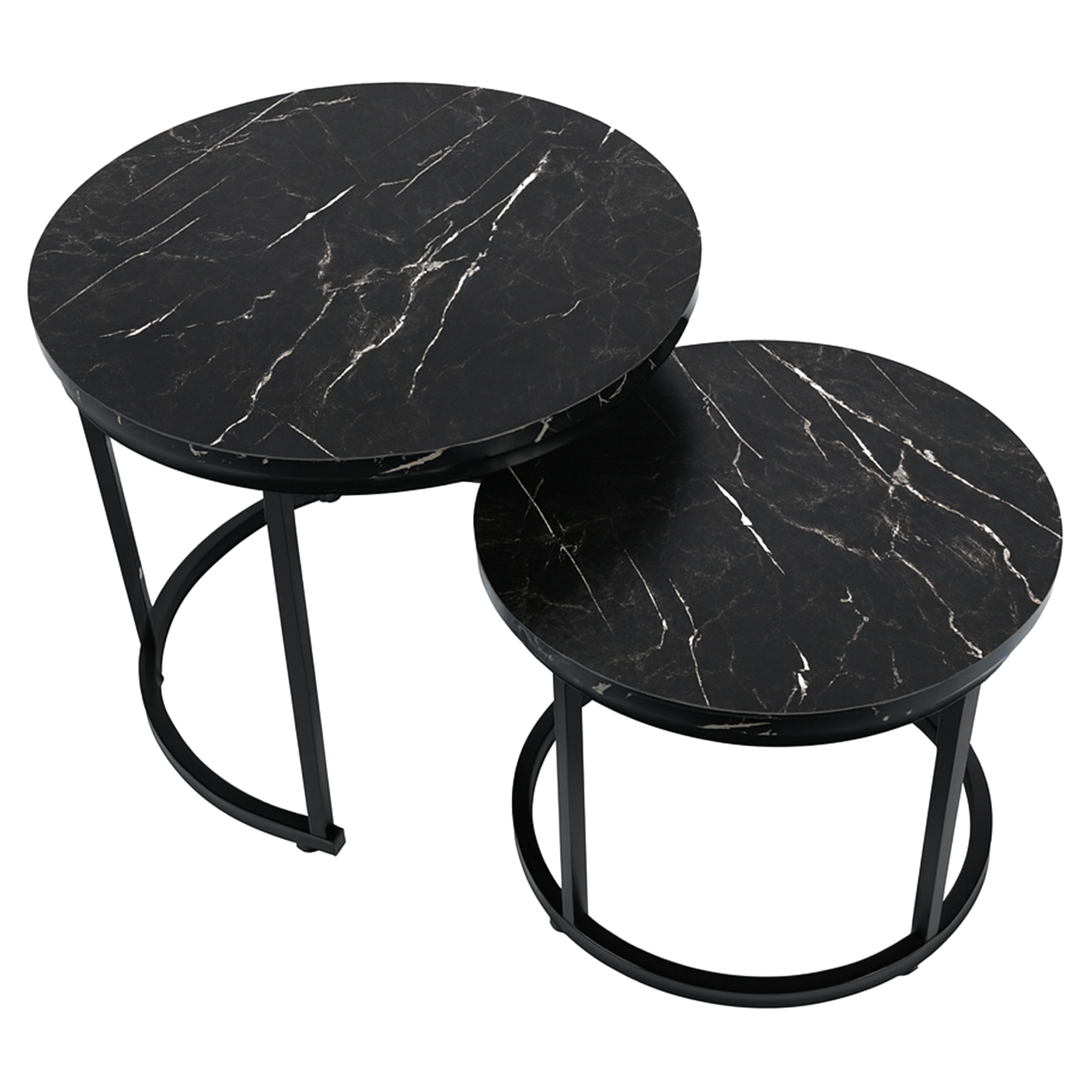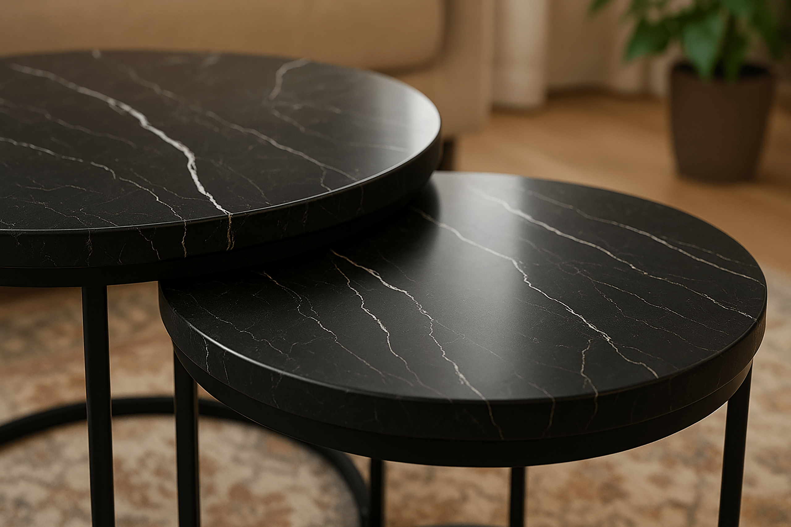 Zestaw 2 okrągłych stolików kawowych SK102MCZ – czarny marmur, styl loftowy Zestaw dwóch okrągłych stolików kawowych SK102MCZ to idealne rozwiązanie dla osób szukających nowoczesnych i praktycznych mebli do swojego wnętrza. Te eleganckie stoliki w kolorze czarnego marmuru doskonale wpisują się w styl loftowy i industrialny, wprowadzając odrobinę luksusu i nowoczesności do salonu, pokoju dziennego czy sypialni. Solidna konstrukcja: Stelaż wykonany z metalu malowanego proszkowo zapewnia trwał