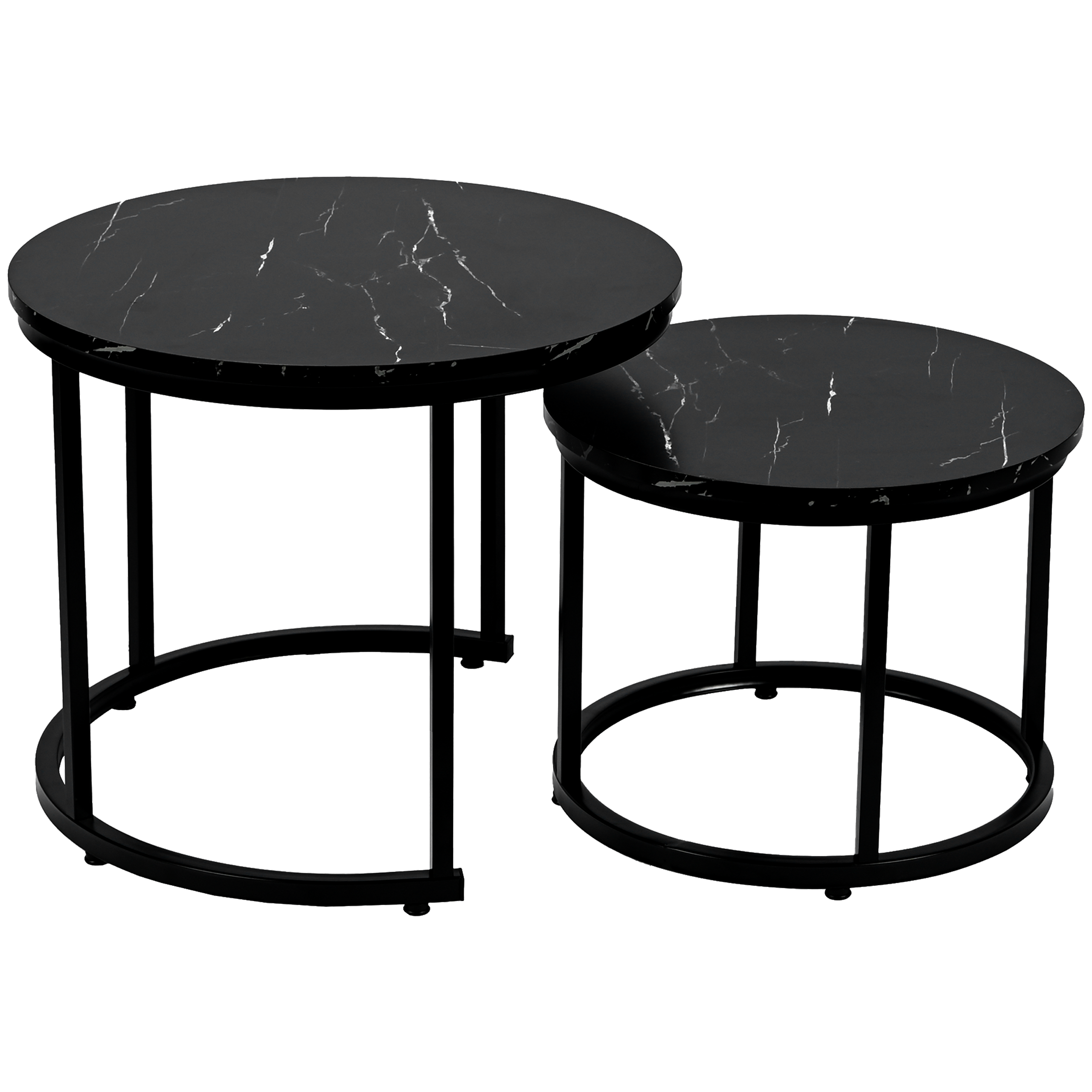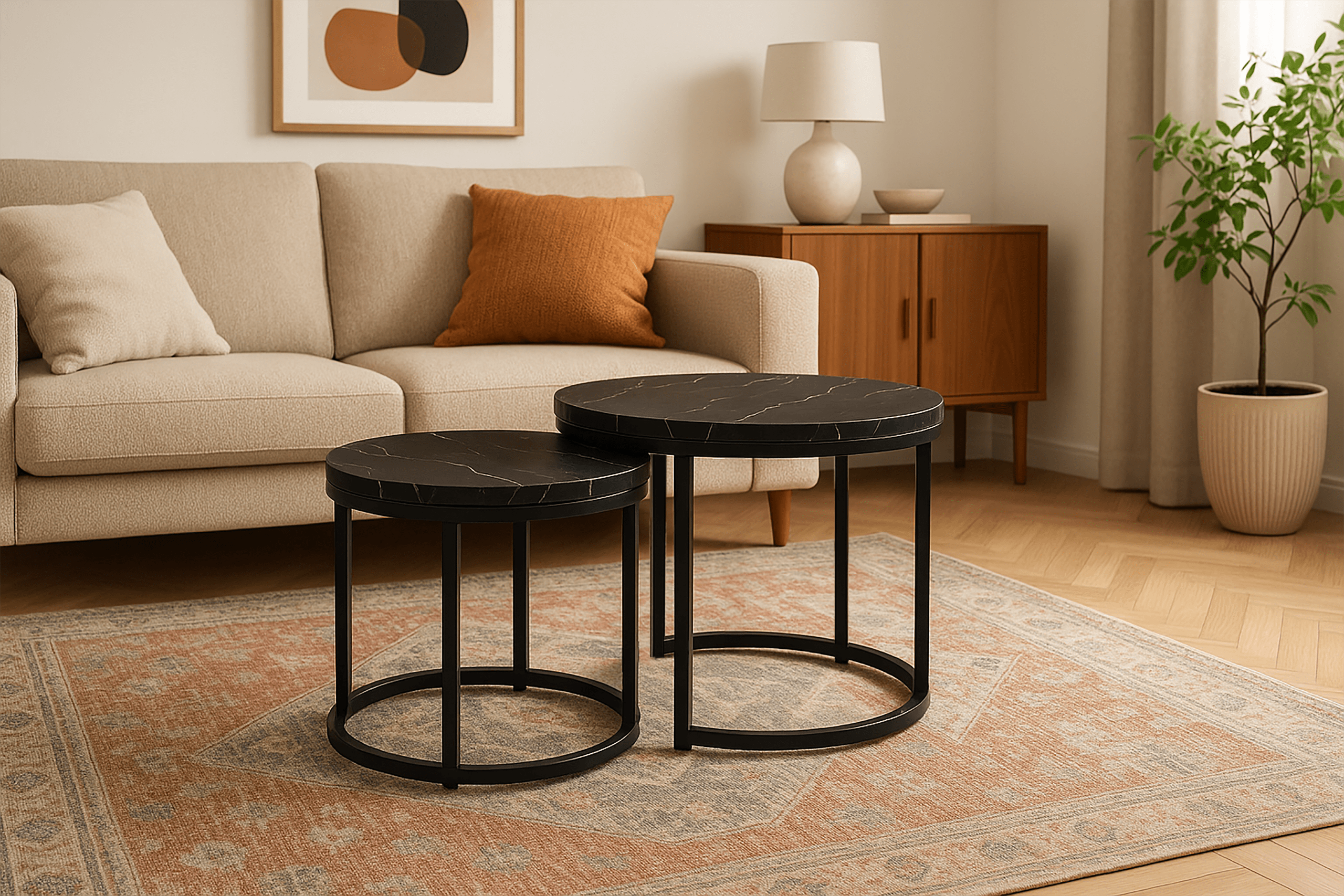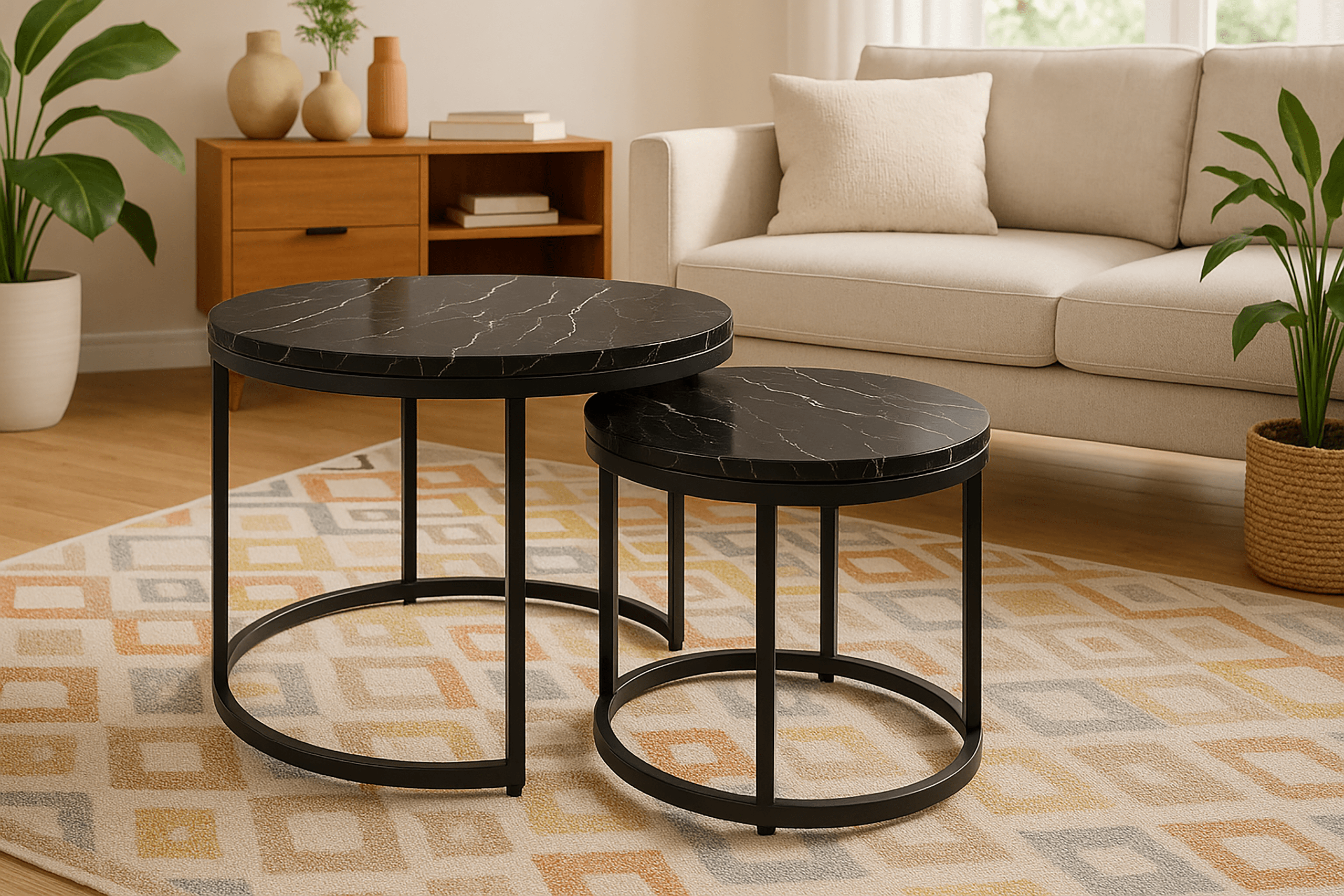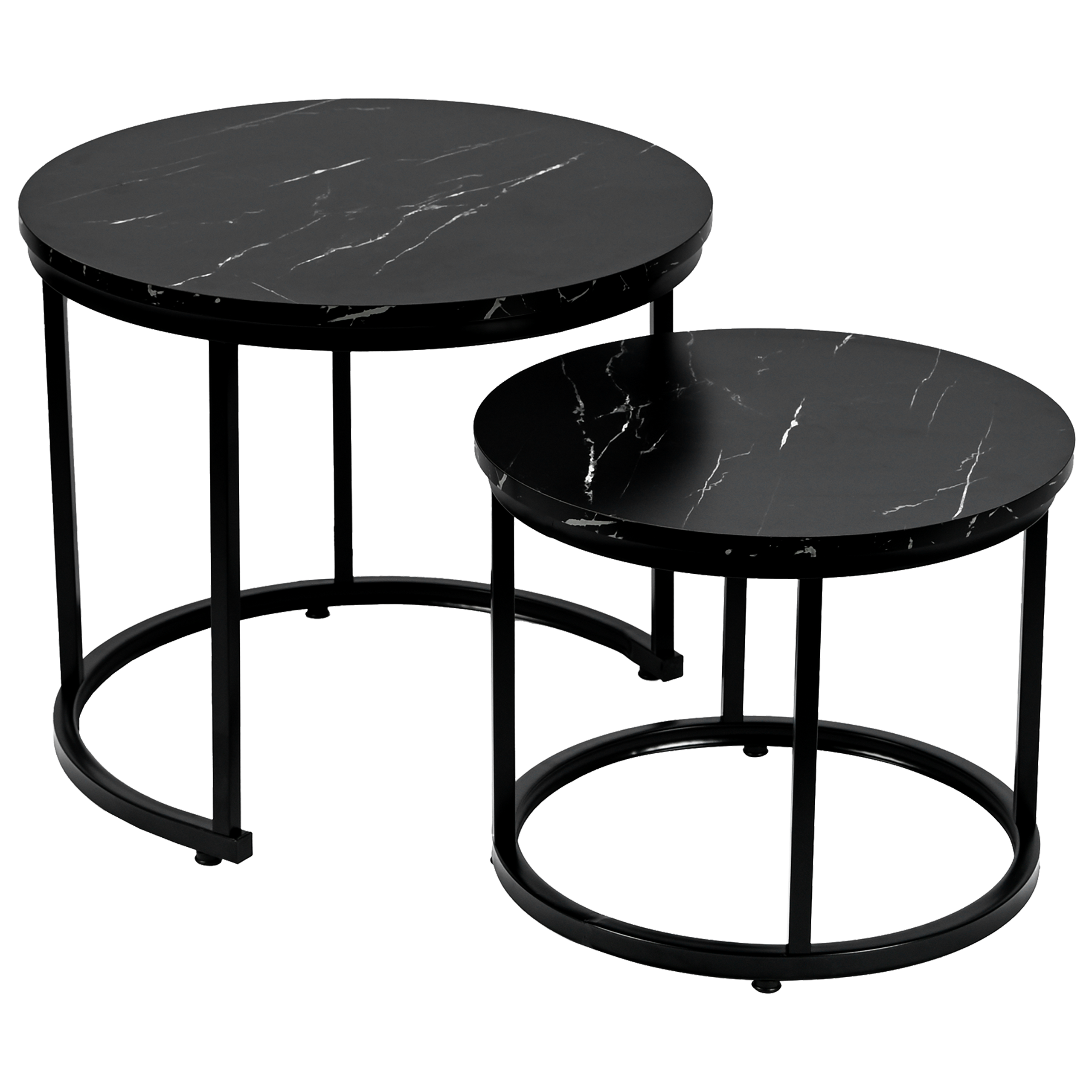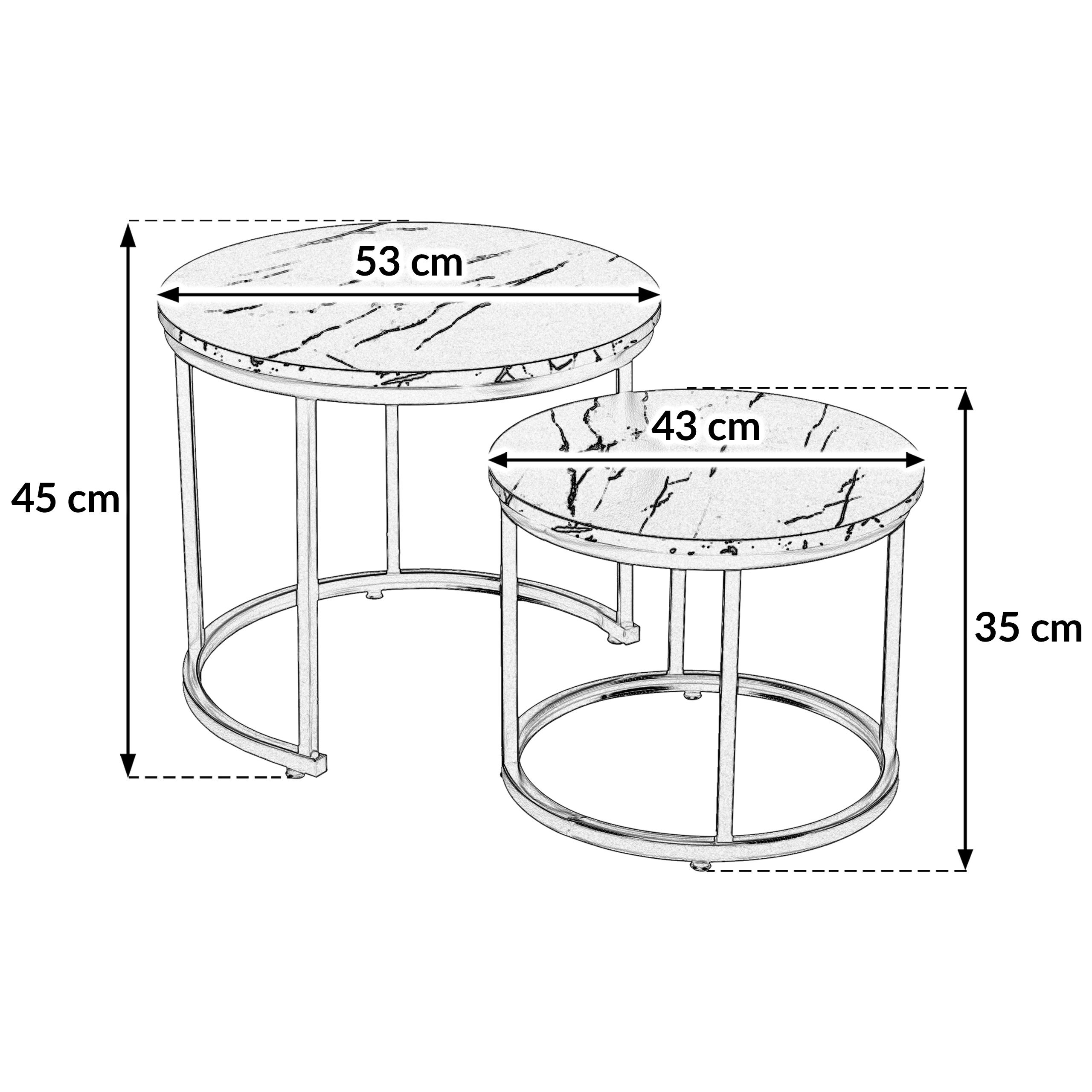 Zestaw 2 okrągłych stolików kawowych SK102MCZ – czarny marmur, styl loftowy Zestaw dwóch okrągłych stolików kawowych SK102MCZ to idealne rozwiązanie dla osób szukających nowoczesnych i praktycznych mebli do swojego wnętrza. Te eleganckie stoliki w kolorze czarnego marmuru doskonale wpisują się w styl loftowy i industrialny, wprowadzając odrobinę luksusu i nowoczesności do salonu, pokoju dziennego czy sypialni. Solidna konstrukcja: Stelaż wykonany z metalu malowanego proszkowo zapewnia trwał